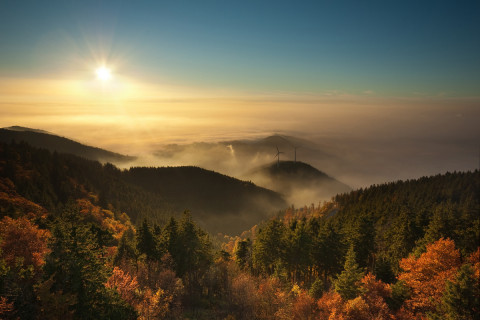 Eigentlich hätte ich lieber einen echten Sonnenuntergang abgelichtet, aber es gab nur aufliegende Wolken, dichten Nebel und keine Spur von Abendlicht. Nach so einer weiten Fahrt wollte ich mich damit nicht abfinden und versuchte mir anders zu behelfen: Besser Kunstlicht (vom Schliffkopfhotel) als gar keins ...