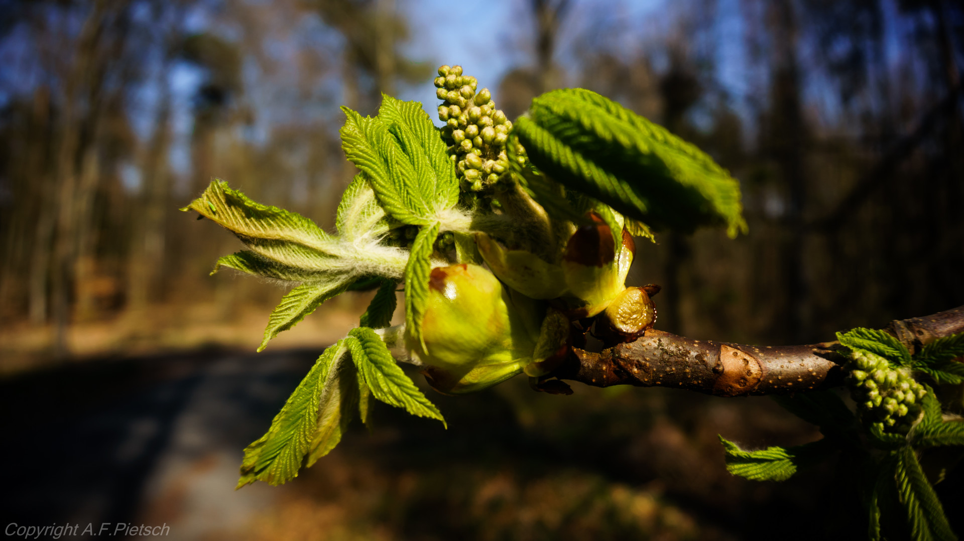 Die gleichzeitige Geburt von Blättern und Blütenstand einer Roßkastanie. Wie wunderbar doch der Frühling ist, wenn das Leben wieder erwacht und anschwillt....