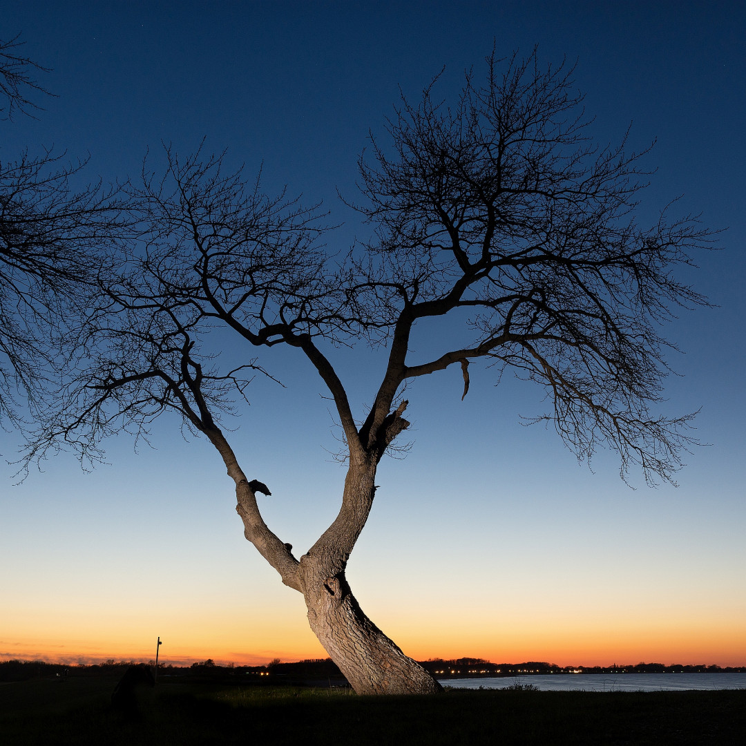 Ein einzelner Baum auf der Deichkrone an der Ostsee seitlich angeblitzt bei fortgeschrittener Dämmerung.