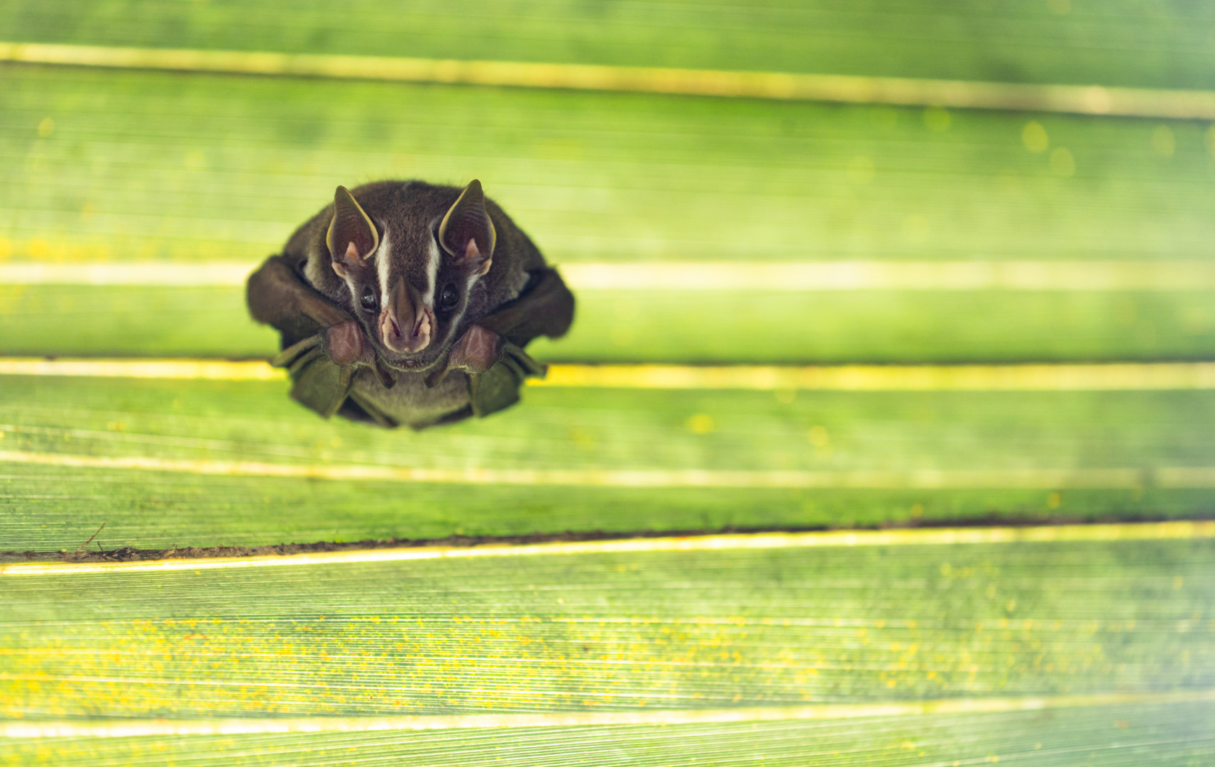 eine Gelbohrfledermaus, die unter einem Palmenblatt hängt....