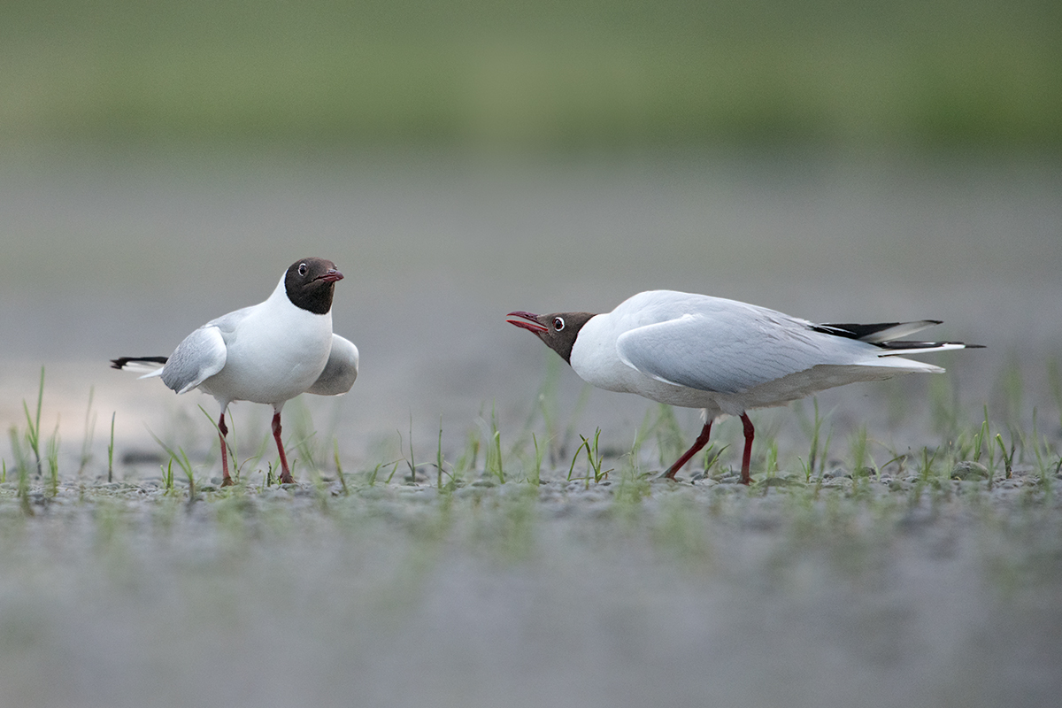 Möwe links guckt ganz erstaunt, warum die andere Möwe so meckert. Schön eingefangen, dieses kleine Intermezzo. Wo stehen die beiden ? ziemlich modderiger Grund, daß die Füße so einsinken. ( Morgendlich mit d )